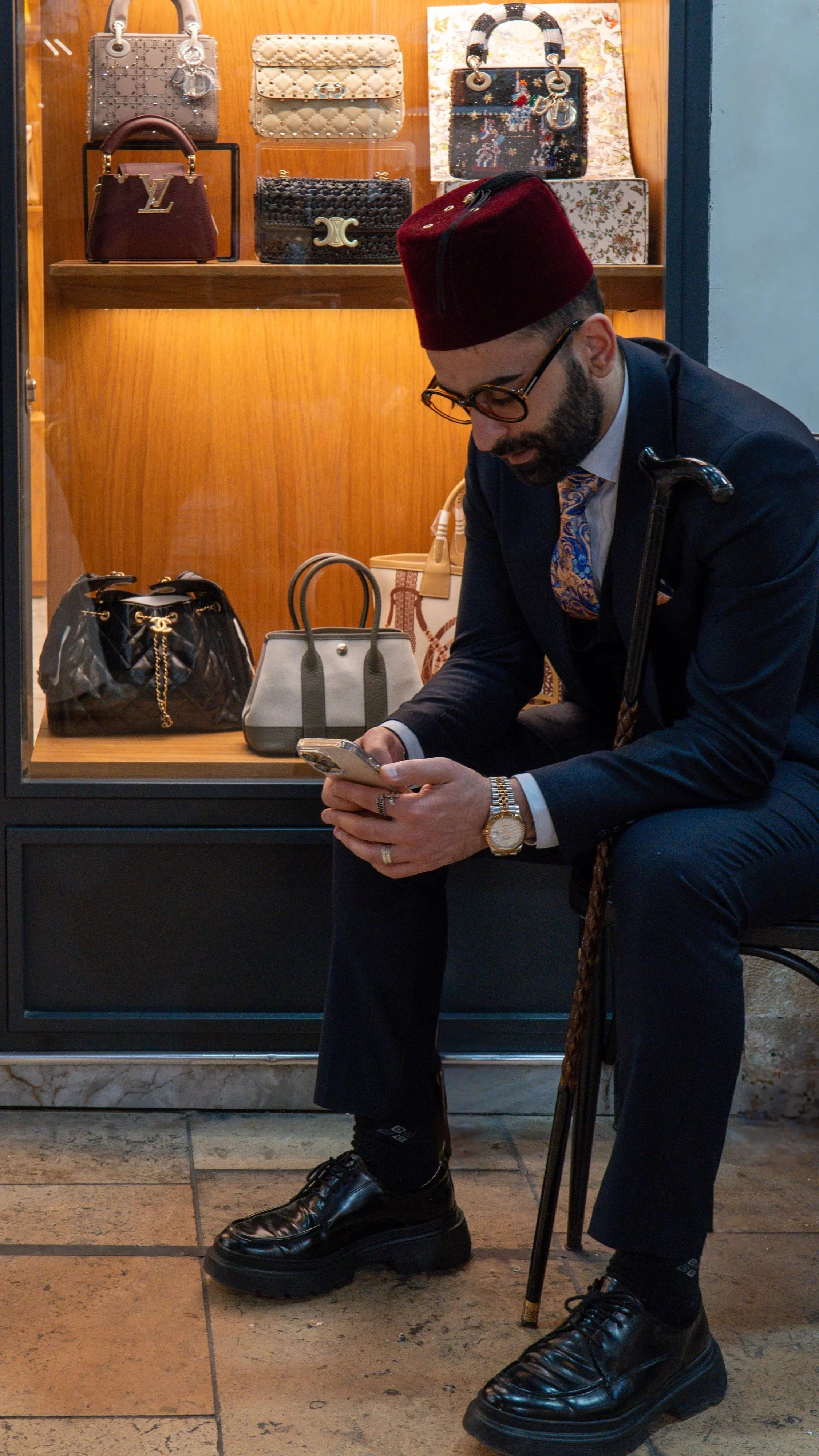 Between Luxury and Silence. Elegance paused on a city bench — a man caught between reflection and distraction, framed by the quiet glamour behind glass.