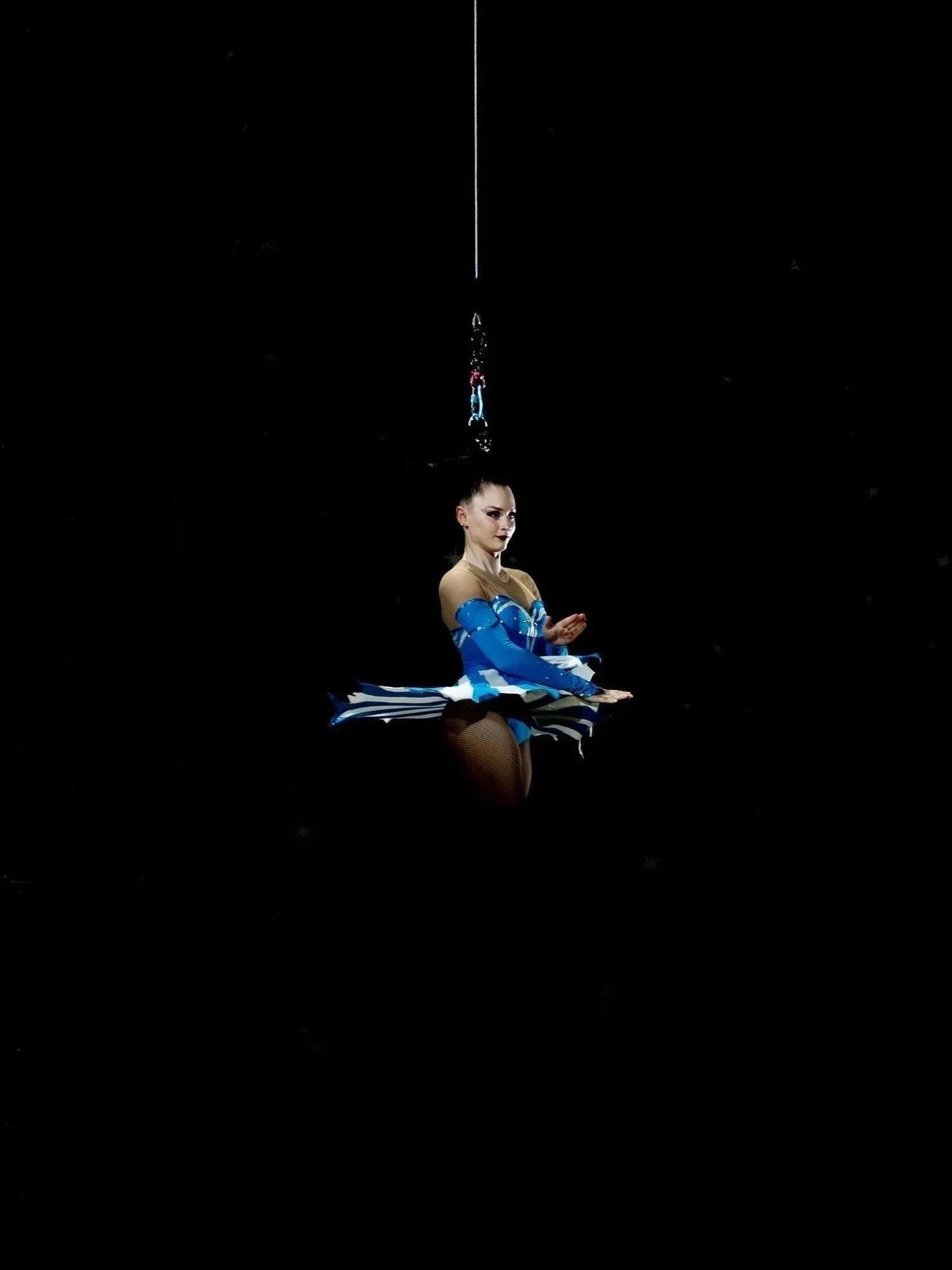 High above the stage, a solitary performer twirls in a wash of white light, arms raised against the darkness. The moment is suspended in quiet elegance an aerial dance defined by strength, style, and a brief encounter with flight.