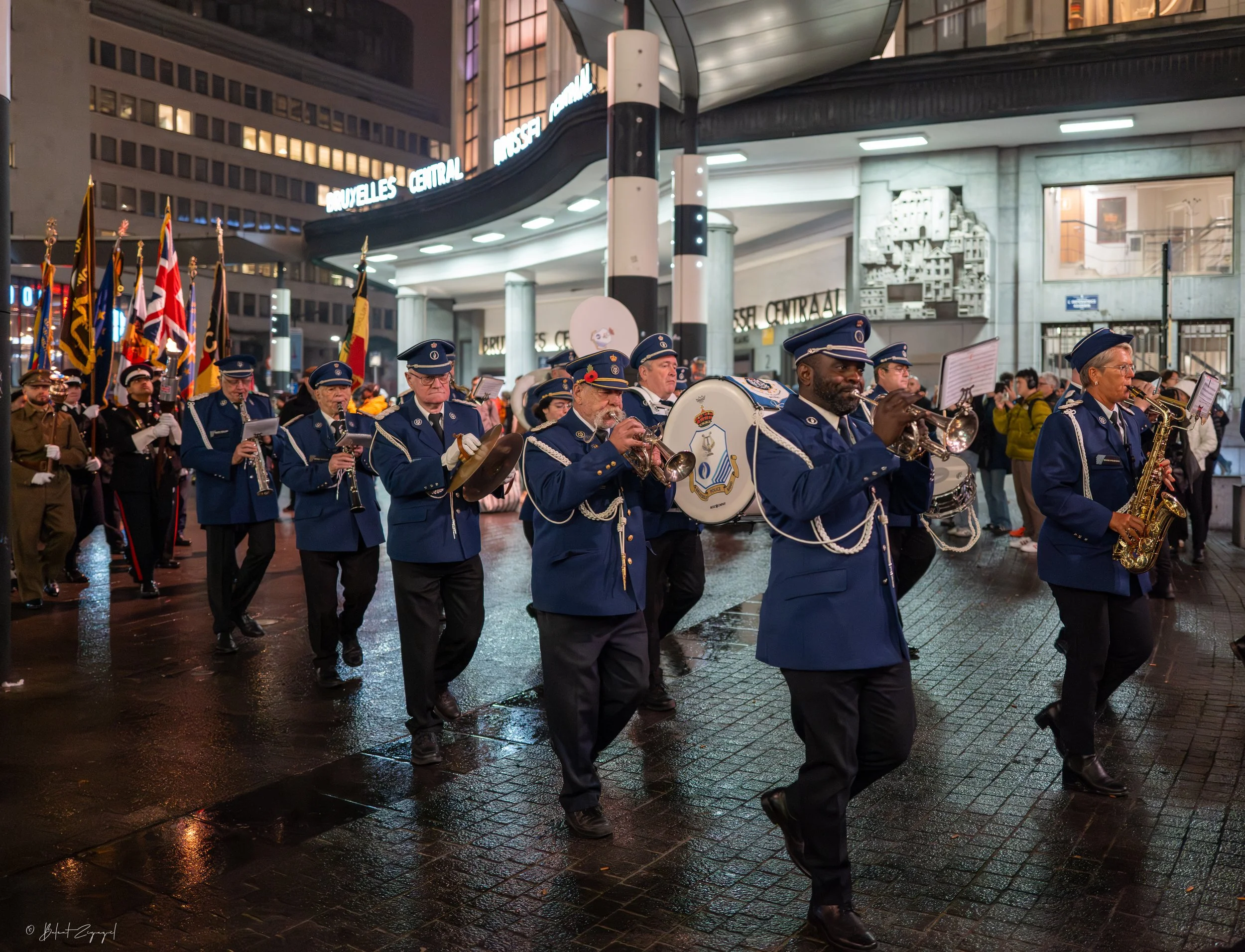 Military brass band marching through Brussels Central Station during Armistice Day ceremony, with flags and crowd visible in background.