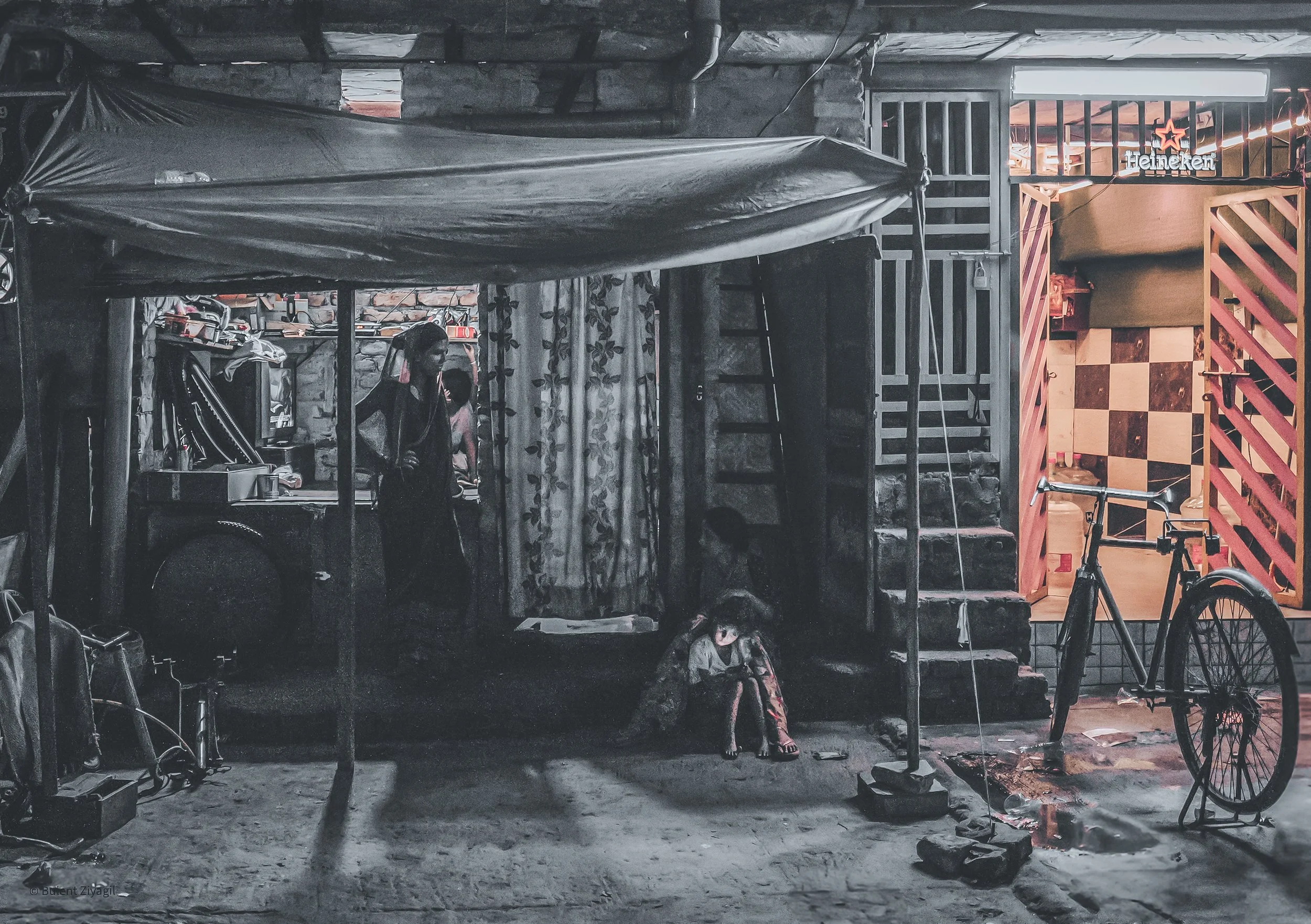 At the edge of the city, a man sits quietly in front of his home. The walls bear the marks of time; plastic cans and weathered fabric share the space. Shadows fall softly, and in this stillness, daily life finds a gentle rhythm—a moment of pause in a world that often rushes past.