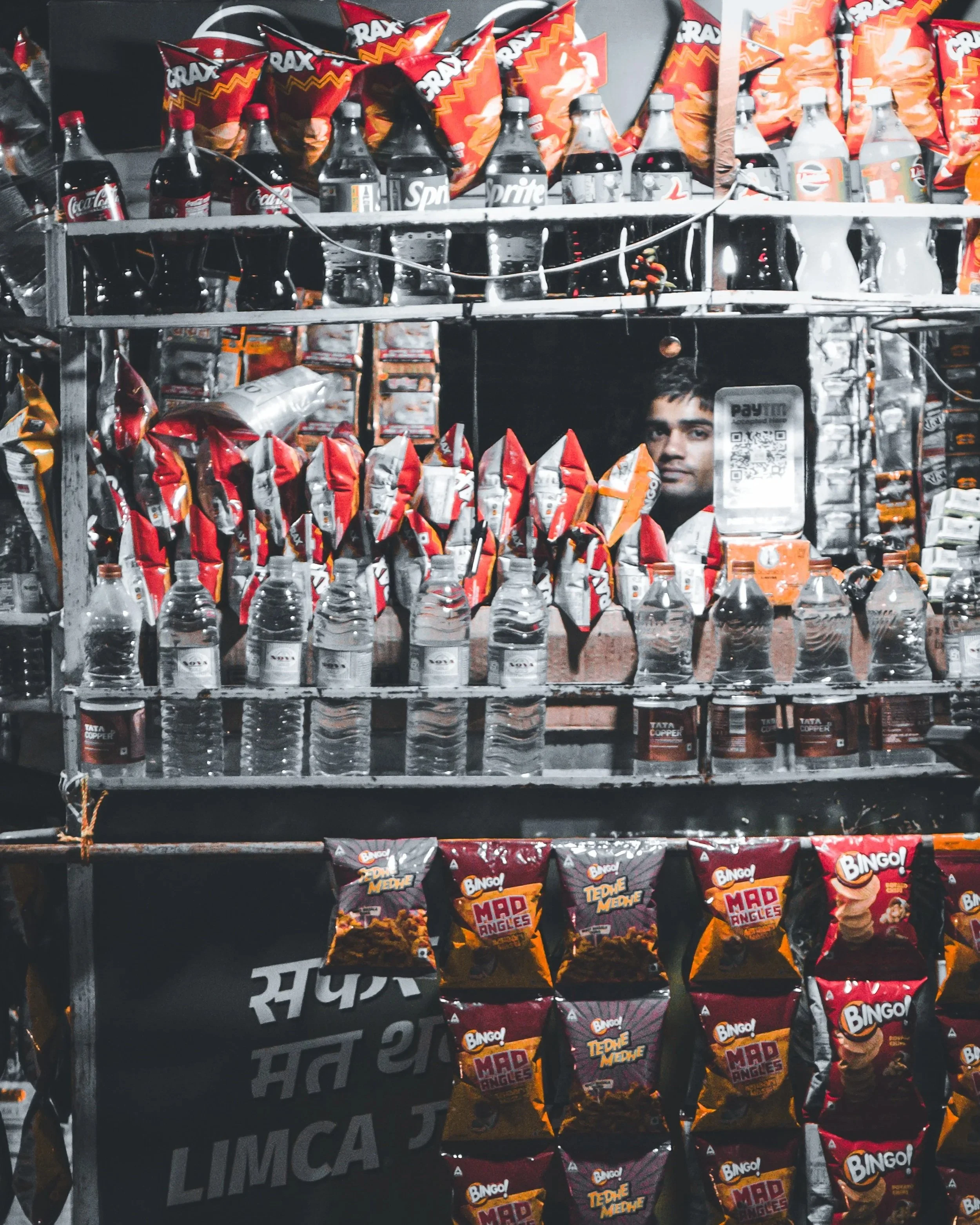 A street vendor’s stall illuminated at night, bursting with color and everyday Indian brands. This photo captures the organized chaos and vibrancy of local commerce that forms the backbone of city life.